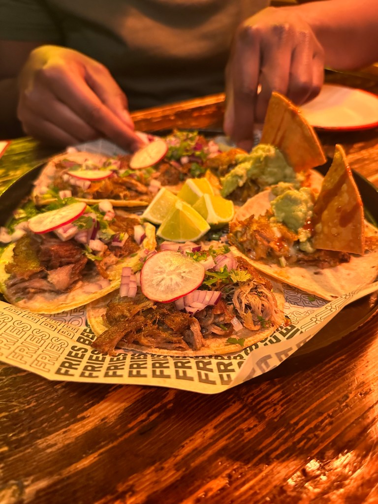 After we had landed and settled into the hostel. The first problem we had to encounter was our hunger. We flew early and didn’t have time for a good breakfast, so before we could be tourists, we had to eat. Fortunately, we had a taco spot a 5-minute walk from the hostel. The taco spot was called Pikio Taco with a rustic neon interior. The staff were welcoming, and whilst they could understand some English, it was nice to have two of the gang be able to speak conversational Spanish. The tacos were absolutely scrumptious and very affordable. It was a great starting point for the holiday.
